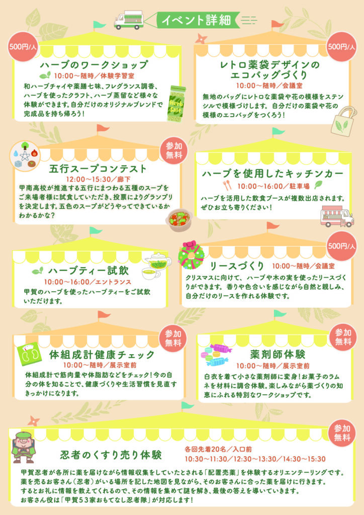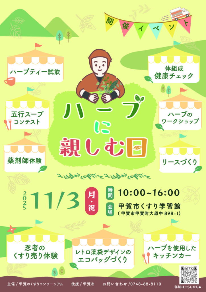 昨年も大好評だったくすりコンソーシアム主催のイベント「ハーブに親しむ日」を開催いたします。くすりのまち・甲賀特有の様々な体験が目白押し!ぜひハーブに親しんでくださいね。 開催概要 タイトル:ハーブに親しむ日日時:2025年11月3日(月・祝)時間:10:00〜16:00会場:甲賀市くすり学習館(甲賀市甲賀町大原中898-1)主催:甲賀のくすりコンソーシアム後援:甲賀市お問い合わせ:0748-88-8110 開催イベント お問い合わせはくすり学習館まで